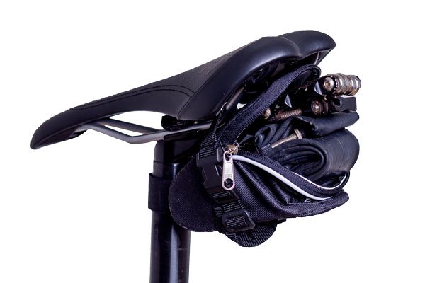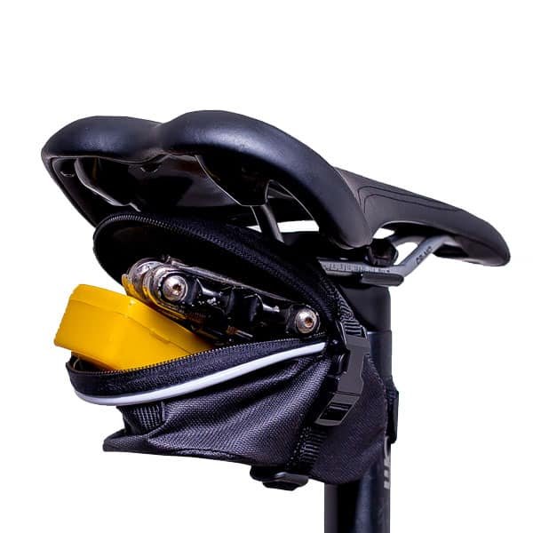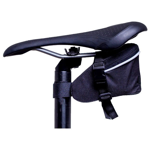 Com grande capacidade e fixação por fitas e fivelas de nylon é uma bolsa leve e prática com custo acessível. Possui fita para fixação de lanterna e é fixada no canote por fita de contato de alta aderência reforçados.