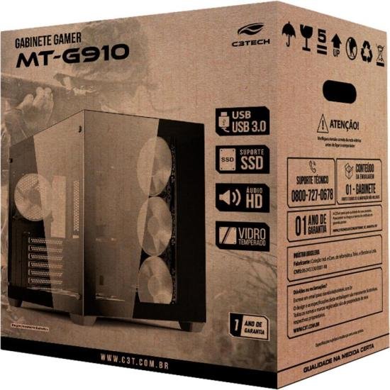 Compatível com placas-mãe ATX, Micro ATX e Mini ITX, o MT-G910 oferece flexibilidade na escolha de hardware, além de praticidade com duas portas USB 2.0, uma porta USB 3.0, e entradas P2 para áudio e microfone. Já o organizador de cabos ajuda a manter um design interno mais limpo e organizado, enquanto a estrutura do gabinete é projetada para ocultar a fonte de alimentação, contribuindo para uma aparência mais minimalista.